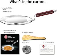 Hawkins Tri-ply Stainless Steel Tava is designed to give you all the advantages of cooking in stainless steel while minimizing the disadvantages of sticking and burning that are normally associated with ordinary stainless steel. The cooking surface (inner surface) is made from 18/8 food-grade (AISI 304) stainless steel which is extremely hygienic, most durable, does not react with most foods and does not pit or corrode. The heavy gauge aluminium core spreads heat well for even cooking with no hot spots, and retains heat for quick cooking. It is sandwiched between two layers of stainless steel and does not come in contact with food on the cooking surface. The base (outer surface) is made of AISI 430 grade magnetic stainless steel. Hence this cookware can be used on all domestic gas, induction, electric, ceramic and halogen cooktops. Hawkins tri-ply stainless steel Tava is durable, well-balanced and stays flat for quick cooking on gas, induction and electric cooktops. The 3.5 mm extra thick tava has a unique shape with a flat base and gentle sloping sides has just the right curvature for optimal cooking results - oil does not pool, nor spill over the sides. The placement of the rivets is carefully designed to maximise the cooking area. The strong Rosewood stay-cool handle is comfortable and safe to hold even when the tava is hot. Material: Superior, "rust-proof", food-grade Tri-Ply Stainless Steel Hawkins Tri-Ply Stainless Steel Cookware retains the advantages of cooking on stainless steel surfaces while eliminating the disadvantages of sticking and burning that come with normal stainless steel Hawkins Tri-Ply Stainless Steel Cookware is made of three layers The Cooking Surface is made of AISI 304, 18/8 food grade stainless steel that is extremely hygienic, durable and non-reactive to most foods. It does not pit or corrode The Core is made of heavy gauge aluminium which spreads heat evenly and prevents hot spots The Base and Outer Surface is made of AISI 430 grade magnetic steel, works well on gas, ceramic, halogen, electric and induction cooktops Brand Hawkins Material Stainless Steel Special Feature Gas Stovetop Compatible, Electric Stovetop Compatible, Induction Stovetop Compatible Colour Silver Capacity 1 litres Compatible Devices Smooth Surface Induction, Gas Product Care Instructions Hand Wash Only Handle Material Stainless Steel Item Weight 862 g Is Oven Safe No