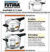 Brand: HawkinsColor: SilverFeatures: Ideal for 6 or 7 Persons The beautiful form and function of the Futura − executed in Stainless Steel The 7 mm thick base contains a 4.9 mm aluminium disc sandwiched in stainless steel for efficient heat dispersion Fingertip steam release Base stays flat always, will not bulge Works on gas, induction, electric, ceramic & halogen Binding: Kitchenmodel number: F-56Part Number: HWS_F56_SIRDetails: A beautiful combination of form and function executed in Stainless Steel. Futura is the only pressure cooker in the world to have been displayed by The Museum of Modern Art, New York. Futura cooks on average 46 percent faster than a microwave oven. The unique pressure regulating system gives you the convenience of finger-tip pressure release and prevents clogging of the steam vent. The 7 mm thick base contains a 4.9 mm thick aluminium disc sandwiched in stainless steel for efficient heat dispersion, the double-thick base stays flat, heats evenly and is ideal for light frying before pressure cooking. Suitable for gas, induction, electric, ceramic and halogen cooktops.EAN: 8901165062532Package Dimensions: 16.3 x 10.1 x 8.6 inches