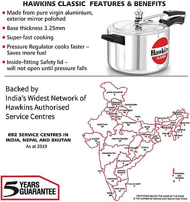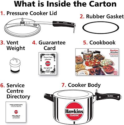 Brand: HAWKINS Color: Silver Features: Hawkins Classic 5 Liter Pressure Cooker with Easy to quarter turn is enough Open & Close Made from commercially pure, virgin aluminum; Mirror polished; interior and base matt finish Features a 'goof-proof' lid that seals from the inside like a jetliner door, ensuring greater safety Inside fitting lid opens only when pressure falls Stay cool handles Pressure is regulated automatically to optimum levels for speed cooking; Shielded Safety valve, Long lasting gasket model number: 8.90117E+12Details: HAWKINS CLASSIC PRESS COOKER 5LT