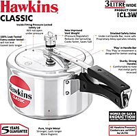 Color: ‎Silver Features: Ideal for 3 or 4 people Made of pure virgin aluminum, outer mirror polish New Improved Induction Base Super Fast Cooking The pressure regulator cooks faster - saves more fuel.Components included: pressure cooker body, pressure cooker lid, rubber gasket, vent weight, guarantee card, cookbook, service center directory Details: The biggest sales of the classic Hawkins are the most popular range of pressure cookers - perhaps because of its attractive combination of features, benefits and price. Each Hawkins classic has an inside-fitting lid. This design is naturally safer than traditional cooker. Hawkins is thus the classic pressure cooker to safety pressure-lock - like jetliner doors! This range was the first to be introduced by Hawkins and has been kept fresh and current by many innovations and improvements over the years. The latest improvement is a 3.25mm new improved induction base and an improved pressure regulating system that controls a narrower, more efficient range of pressure, reduces germination of frothy foods (such as lentils) and is easier to insert and remove. The safety valve lid is located under the handle bar so that the steam is safely deflected downwards when it works. The gasket has minimal exposure to steam inside the cooker, does not rub every time the product is opened and closed - so lasts for a long time. Keep cool handles. Fixed strong pivot does not put pressure on the plastic handle as it is part of the metal handle. Thus the handles last longer. Recommended for use on gas, electric, halogen, ceramic and induction cooktops. Model: ‎ICL3WItem Condition: New