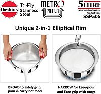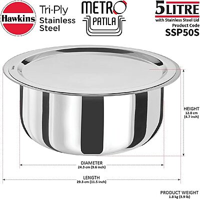HAWKINS 5 Litre Triply Stainless Steel Cooking Pot, Silver (SSP50S), 2.5 mm Thick, 18/8 Food Grade Lid, Unique Elliptical Rim, Induction, Gas, Electric Compatible