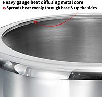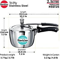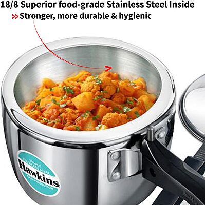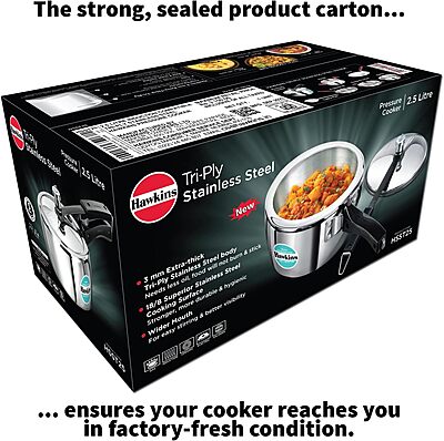 The Hawkins 2.5 Litre Triply Stainless Steel Pressure Cooker is your Culinary companion for Effortless and Flavorful Cooking! This 2.5-liter inner lid cooker, in elegant silver, is designed to elevate your cooking experience in every way possible. Perfect for 2 or 4 Persons: This pressure cooker is thoughtfully sized for smaller households, making it the ideal choice for couples or small families. Cook just the right amount of food without wastage or hassle. 3 mm Extra-Thick Triply Stainless Steel: The 3 mm extra-thick triply stainless steel construction ensures uniform heating throughout the base and sides of the cooker. Say goodbye to burnt or sticky food; this cooker prevents scorching and sticking, reducing the need for excessive oil. Wider Mouth for Easy Stirring: Enjoy effortless cooking with the wider mouth design, allowing for easy stirring and better visibility of your culinary creations. You'll have full control over your dishes without compromising on convenience. 18/8 Superior Food-Grade Stainless Steel Inside: The interior of this pressure cooker is crafted from 18/8 superior food-grade stainless steel, making it stronger, more durable, and highly hygienic. Your food remains uncontaminated and safe to consume. Heavy Gauge Heat-Diffusing Metal Core: Featuring a heavy gauge heat-diffusing metal core, this pressure cooker evenly spreads heat from the base to the sides, ensuring consistent cooking results. Say goodbye to unevenly cooked meals. AISI 430 Magnetic Stainless Steel Outside: The outer layer is made of AISI 430 magnetic stainless steel, making it compatible with both gas and induction cooktops. It offers versatility in your kitchen, allowing you to use it with your preferred cooking method. Sturdy, Stay-Cool Plastic Handles: The cooker is equipped with sturdy plastic handles that remain cool to the touch, providing a comfortable and safe grip. Handle your cooker with ease, even when it's hot. Whether you're whipping up a quick weekday meal or indulging in a weekend feast, this cooker ensures that your dishes are cooked to perfection every time. Ideal for 2 or 4 persons 3 mm Extra-Thick Triply Stainless Steel Uniformly heats base and sides - Food and spices do not burn & stick. Needs less oil Wider Mouth - For easy stirring & better visibility 18/8 Superior food-grade Stainless Steel Inside - Stronger, more durable & hygienic Brand HAWKINS Capacity 2.5 Liters Material Stainless steel Colour Silver Finish type Glossy