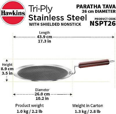 Description Hawkins Tri-ply Stainless Steel Paratha Tava is designed to give you all the advantages of cooking in stainless steel while minimizing the disadvantages of sticking and burning that are normally associated with ordinary stainless steel. The cooking surface (inner surface) is made from 18/8 food-grade (AISI 304) stainless steel which is extremely hygienic, most durable, does not react with most foods and does not pit or corrode. Nonstick on top of the cooking surface is shielded by Stainless Steel ridges, so that metal spatula can be used while cooking. It causes less wear and tear, and hence Nonstick lasts longer. The heavy gauge aluminium core spreads heat well for even cooking with no hot spots, and retains heat for quick cooking. It is sandwiched between two layers of stainless steel and does not come in contact with food on the cooking surface. The base (outer surface) is made of AISI 430 grade magnetic stainless steel. Hence this cookware can be used on all domestic gas, induction, electric, ceramic and halogen cooktops. Hawkins tri-ply stainless steel Tava is durable, well-balanced and stays flat for quick cooking on gas, induction and electric cooktops. The 3.5 mm extra thick tava has a unique shape with a flat base and gentle sloping sides has just the right curvature for optimal cooking results - oil does not pool, nor spill over the sides. The placement of the rivets is carefully designed to maximise the cooking area. The stay-cool, natural and durable Rosewood wire handle is comfortable and safe to hold even when the tava is hot. Nonstick shielded by Stainless Steel ridges - Can use metal spatula. Less wear and tear, lasts longer Extra-Thick 3.5 mm Tri-Ply - Retains heat well. Cooks evenly Stay-cool Rosewood Handle - Comfortable to hold even when Tava is hot Stainless Steel Rivets and Bracket - Firmly fixed. Will not loosen Stainless Steel Base - AISI 430 magnetic Stainless Steel. Works on Gas + Induction Low oil tasty parathas, pancakes and chillas Brand HAWKINS Material Stainless Steel Special feature Durable Colour Silver Capacity 1 Liters Compatible devices Smooth Surface Induction
