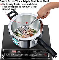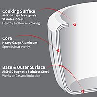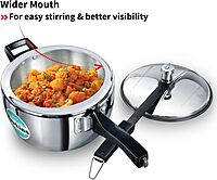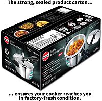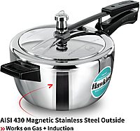 Size: The pressure cooker is designed to be ideal for cooking for 4 or 5 persons, which should accommodate your needs. Material: It is made of 3 mm extra-thick triply stainless steel, which provides durability and excellent heat distribution. Heat Distribution: The triply construction ensures that the pressure cooker uniformly heats the base and sides, preventing food and spices from burning or sticking. This feature also reduces the need for excessive oil while cooking. Wide Mouth: The pressure cooker features a wider mouth, allowing for easy stirring and better visibility of the food while cooking. Interior Material: It has an 18/8 superior food-grade stainless steel interior, ensuring strength, durability, and hygienic cooking conditions. Heat Diffusing Metal Core: The pressure cooker is equipped with a heavy gauge heat diffusing metal core, which spreads heat evenly through the base and up the sides. This ensures that your food cooks uniformly and efficiently. Compatibility: The pressure cooker's exterior is made of AISI 430 magnetic stainless steel, making it compatible with both gas stoves and induction cooktops. Handles: It has sturdy, stay-cool plastic handles that are designed to be comfortable to hold, providing a secure grip and enhanced safety while handling the pressure cooker. Overall, the Hawkins Triply Stainless Steel Pressure Cooker seems to meet your requirements for a pressure cooker option ideal for 4 or 5 persons. It offers features such as even heat distribution, durability, compatibility with different stovetops, and comfortable handles. Ideal for 4 or 5 persons 3 mm Extra-Thick Triply Stainless Steel - Uniformly heats base and sides - Food and spices do not burn & stick. Needs less oil Wider Mouth - For easy stirring & better visibility 18/8 Superior food-grade Stainless Steel Inside - Stronger, more durable & hygienic Heavy gauge heat diffusing metal core - Spreads heat evenly through base & up the sides Brand HAWKINS Capacity 3.5 Liters Material Stainless steel Colour Silver Finish type Metallic