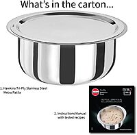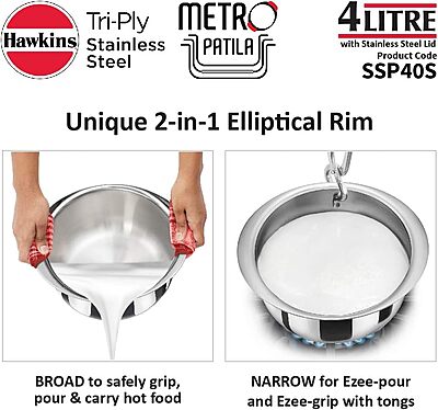 About this item 2.5 mm Thick Hawkins Tri-Ply Stainless Steel - Food-grade, hygienic, spreads heat evenly Unique 2-in-1 Elliptical Rim - Broad to safely grip, pour & carry hot food and narrow for Ezee-pour and Ezee-grip with tongs Cook and serve - One dish to cook, serve, store and clean! Food stays hot longer Stackable, space-saver design - Fit into each other - frees up space in Modern Kitchens AISI 304, 18/8 food grade Stainless Steel Lid - extremely hygienic, durable and non-reactive to most foods Works on Gas, Induction, Oven, Electric, Ceramic and Halogen Cooktops {"isPOv2Enabled":true} Brief content visible, double tap to read full content. Full content visible, double tap to read brief content. Product details Material Aluminium Finish type Uncoated Brand HAWKINS Colour silver Capacity 4 Liters Product dimensions 20D x 34W x 20H centimetres