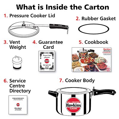 Sales Package Pressure Cooker Body, Pressure Cooker Lid, Rubber Gasket, Vent Weight, Guarantee Card, Cookbook with Service Centre Directory Capacity 5 litre Model Name Classic (ICL50) Model Number ICL50 Lid Locking Mechanism Locking Loop, Inner Lid Dishwasher Safe No Height 215 mm Weight 1.831 kg Net Quantity 1